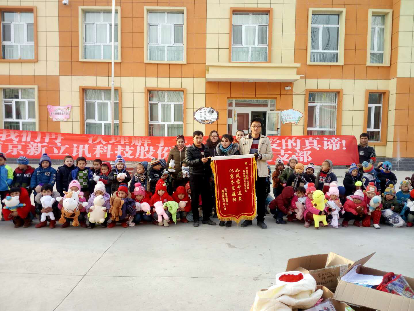 新疆和田市皮縣闊向買里村新建一座幼兒園,地處偏遠,玩具購買不便,幼兒園成立后一直沒有玩具,幼兒午休棉被短缺。新立訊企業(yè)對社會公益事業(yè)一直秉承著回饋社會、勇于承擔社會責任的宗旨。新立訊企業(yè)董事長和高層領(lǐng)導了解該幼兒園情況后,決定以新立訊黨支部的名義進行點對點幫扶。
