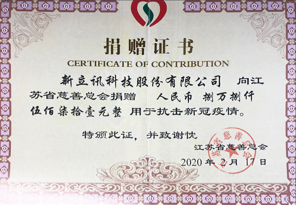 自新冠肺炎疫情發生以來,新立訊公司高度關注疫情進展,一方面從實從細抓好企業內部的疫情防控工作,另一方面積極復工復產支持和配合政府做好疫情防控。與此同時,新立訊不忘感恩社會,通過江蘇慈善總會給疫情重災區湖北捐款5萬元,并積極動員公司全體員工進行募捐,籌得全體員工、分支機構及家屬、愛心人士善款38571元,共計籌得善款88571元,所有善款通過江蘇慈善總會轉給湖北疫情災區。